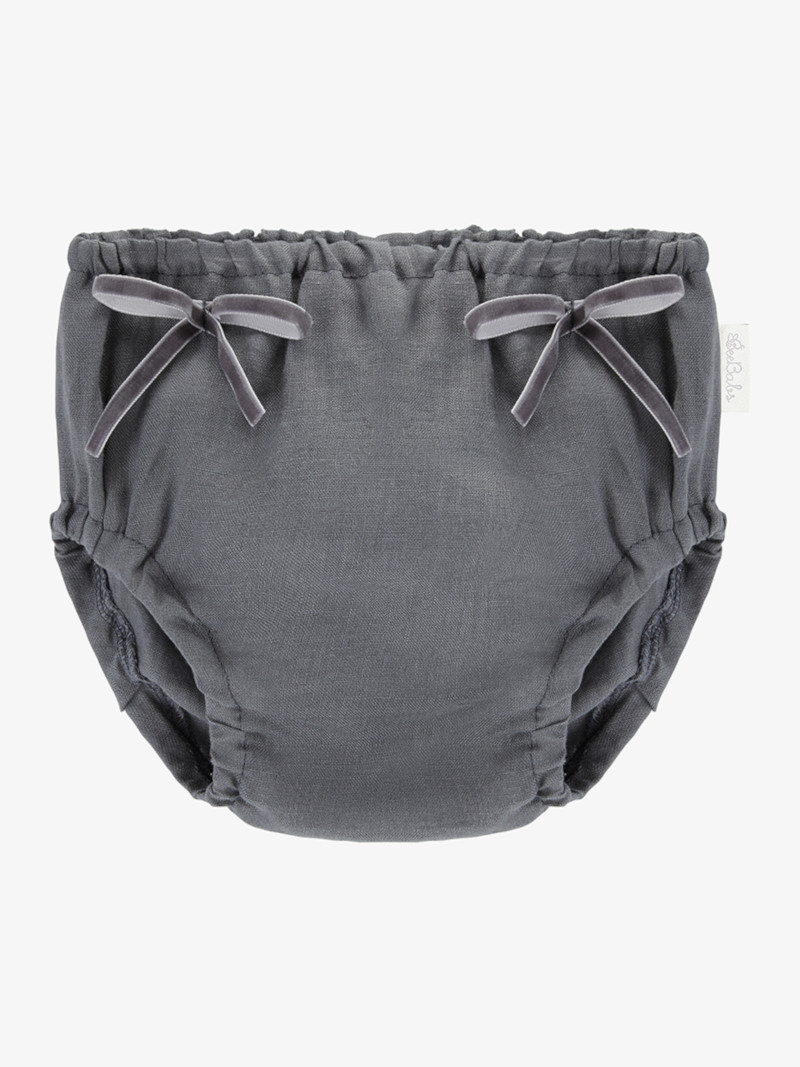 Lniane majteczki na pieluszkę z atłasowymi kokardkami.