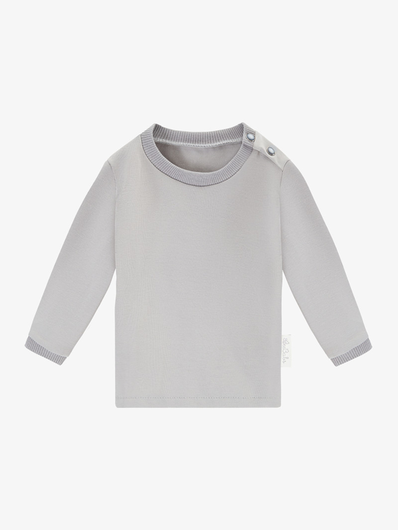 Long sleeve Basic Wear, kolor szary, wykonany z wysokiej jakości certyfikowanej bawełny. Posiada rozpięcie przy dekolcie dzięki czemu łatwo się zakłada przez główkę maluszka. Pięknym detalem są perełkowe klipsy.