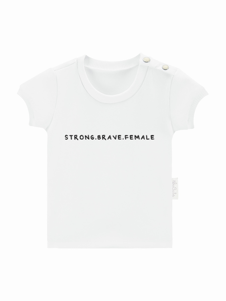 T-shirt Strong.Brave.Female to limitowany produkt w naszej ofercie. T-shirt posiada rozpięcie przy dekolcie dzięki czemu łatwo się zakłada przez główkę maluszka. Pięknym detalem są perełkowe klipsy. Kolor biały.